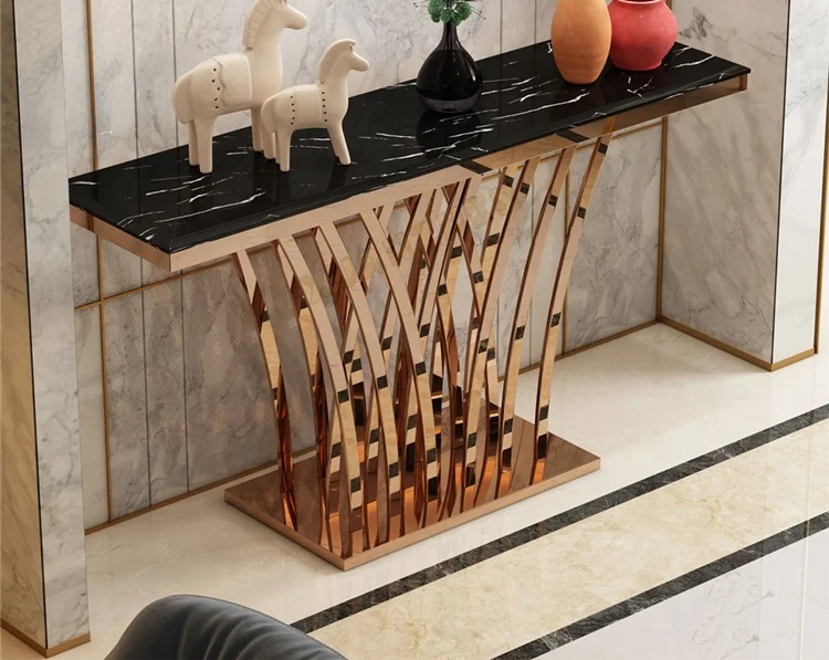 Enhance your interiors with this luxury marble top console table, crafted using a high-quality stainless steel (SS) frame and finished with a premium PVD coating. The elegant marble top adds timeless beauty, while the sleek metal structure ensures strength and durability. Proudly made in India, this console table is fully customizable in size and finish, making it ideal for bespoke modern interiors.