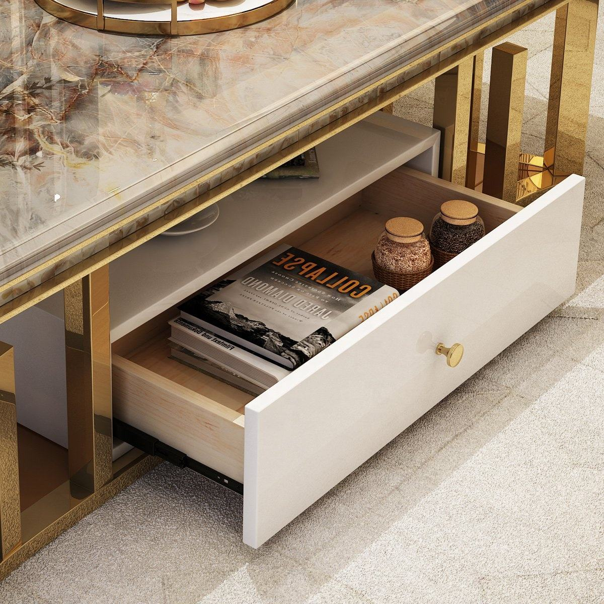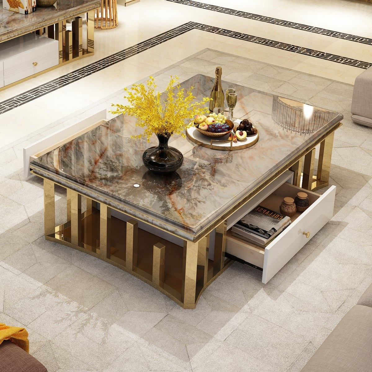 Enhance your living space with this modern design coffee table featuring a premium rectangular marble top and stainless steel legs finished in rich gold PVD. Designed for contemporary interiors, this centre table blends elegance, strength, and timeless appeal. The natural marble surface adds luxury, while the durable stainless steel frame ensures long-lasting stability and performance.