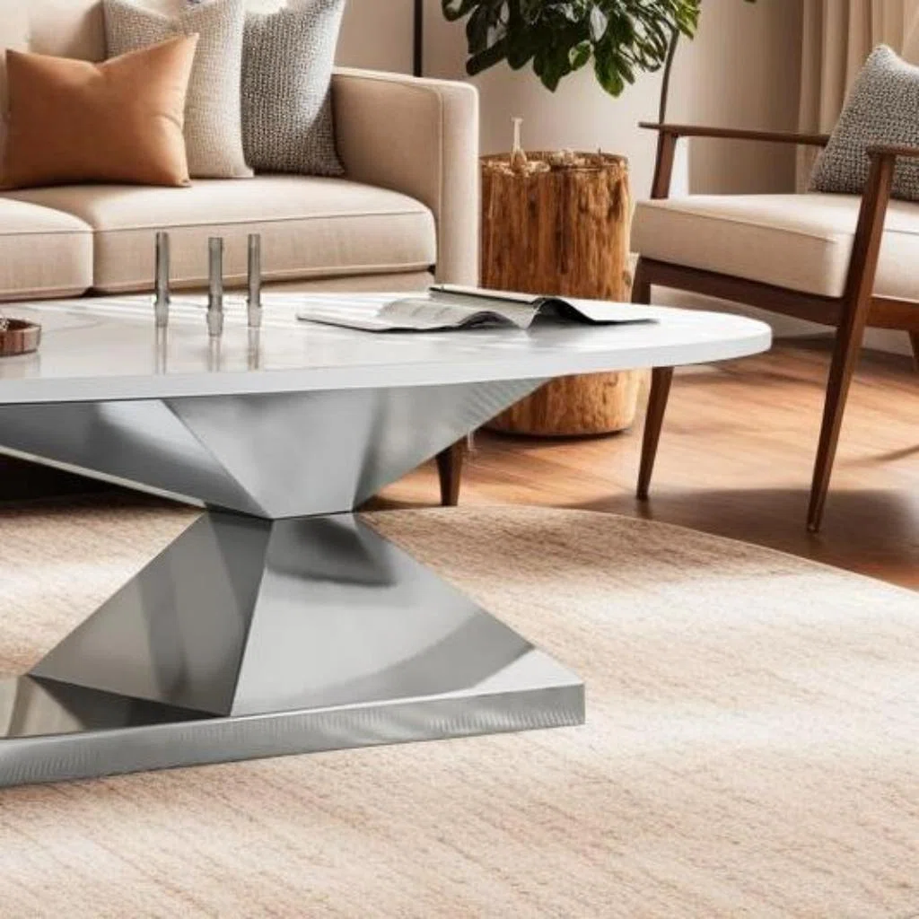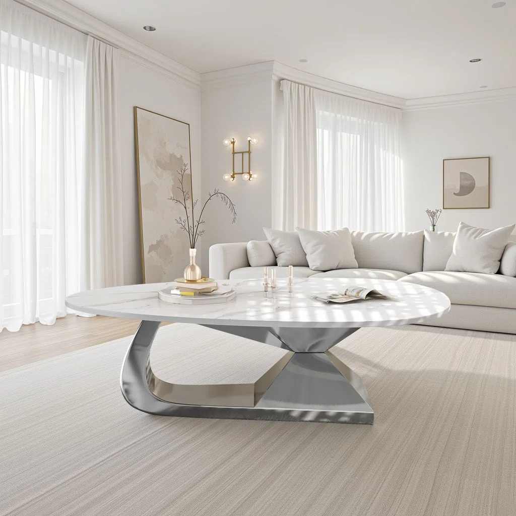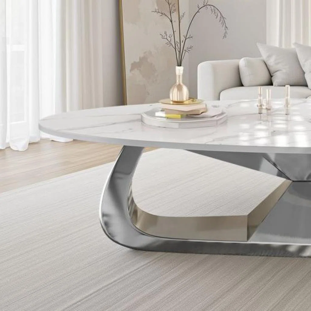 Modern Sintered Stone Coffee Table with Stainless Steel Base – Silver with Marble Top