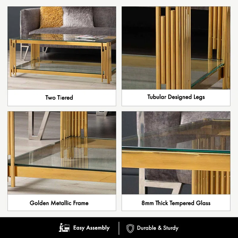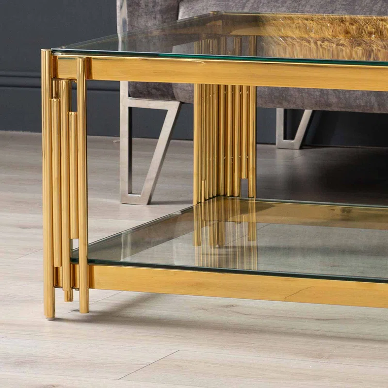 Bring modern elegance to your living space with this stainless steel gold coffee table, featuring a sleek 2-tier glass design and a rich PVD gold finish. Crafted from high-quality stainless steel, this table offers exceptional strength, stability, and long-lasting shine. The dual glass tiers provide both style and functional display space, making it a perfect centerpiece for contemporary interiors.